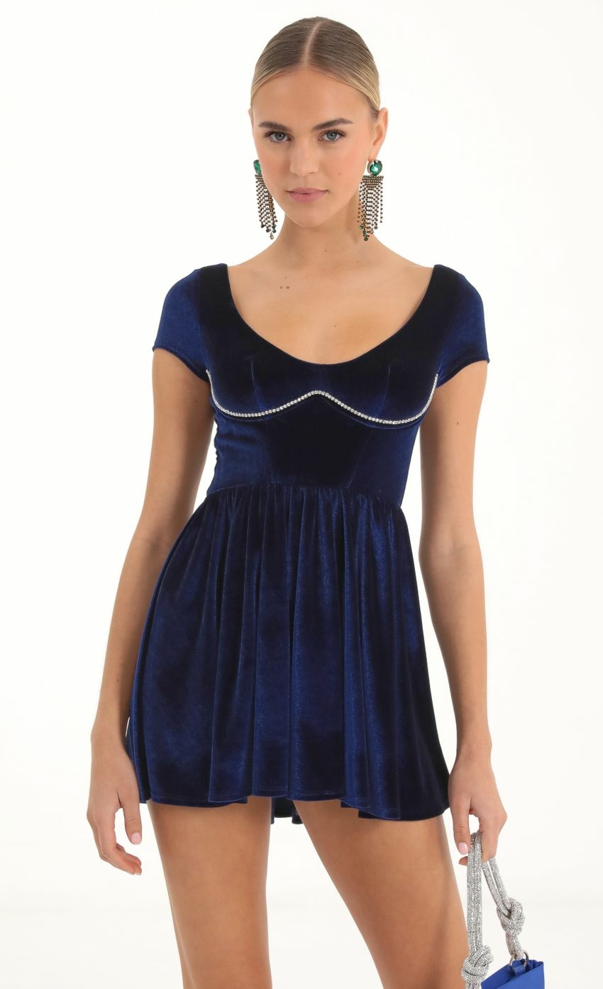 Lucy in the Sky Rhinestone Velvet Corset Flare Dress in Navy