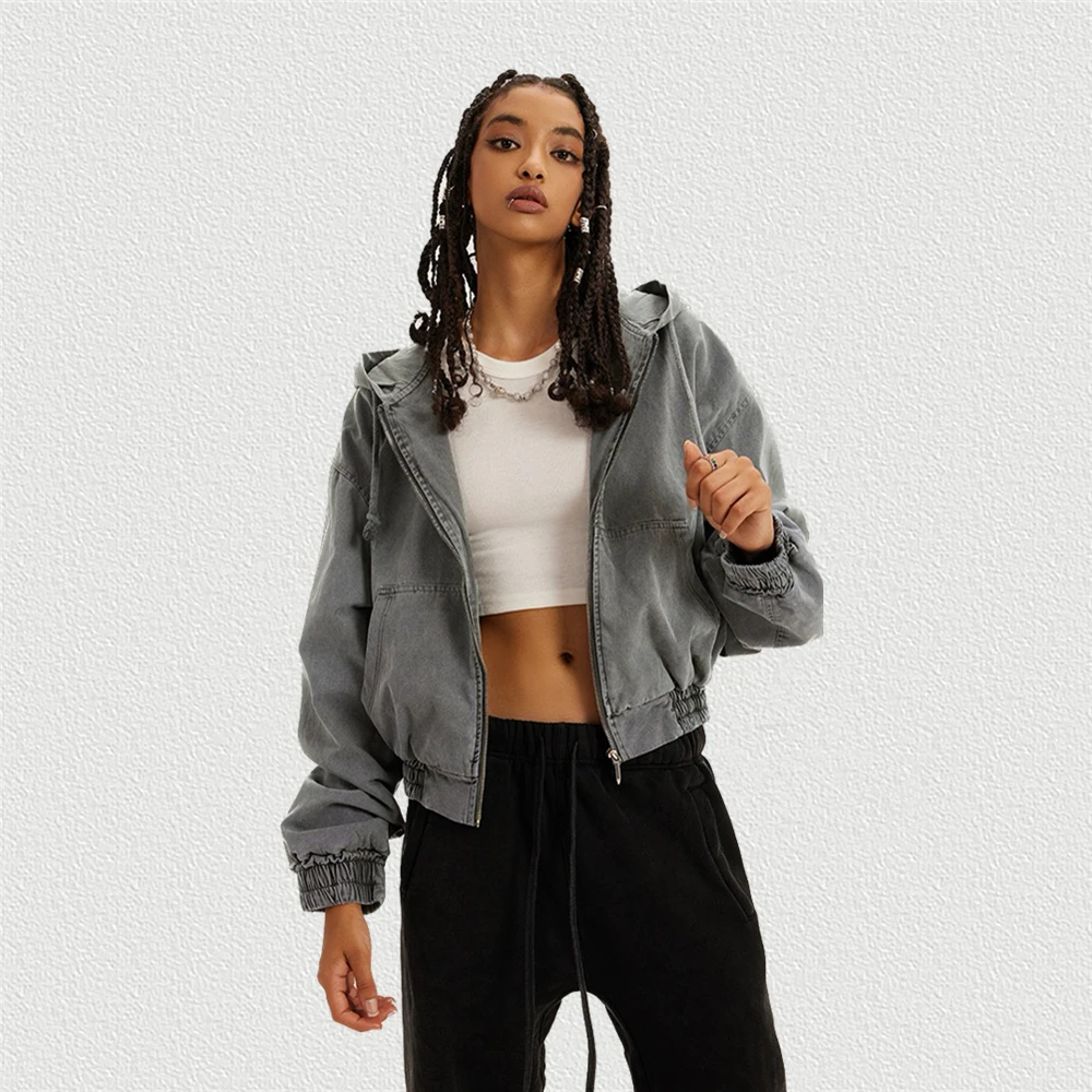SLASKUST Retro 2023 Distressed Zipper Jacket Women Washed Heavy Cotton Hooded Coat Short-Length Styling - AliExpress
