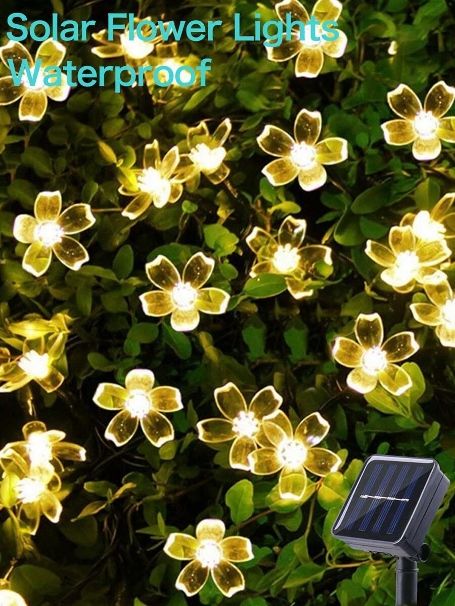 SHEIN 1 pieza Guirnalda de luces solares con diseño de flores para jardín, 20/50/100 LED, 5M/7M/12M, luz blanca cálida, a prueba de agua, con 8 modos de iluminación para decoración de césped, jardín, patio, balcón, decoración de otoño, decoración del hogar