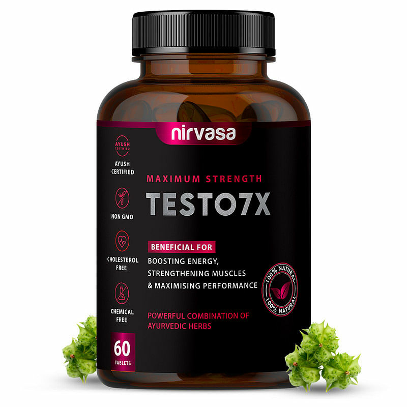 Nirvasa TESTO7X Tablet for Stamina, Performance and boosts T-Level in men enriched with Tribulus terrestris, Ashwagandha, Shilajit, Safed Musli, Kaunch Beej & Many more Herbs, Easy to swallow, Allergan Free Tablet, Pure Ayurvedic, 1B (1 X 60 Tablets)