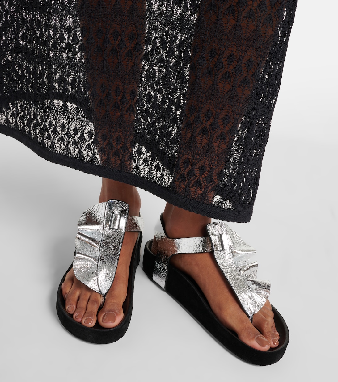 Complete your ensemble with Isabel Marant’s Isela metallic leather sandals. These sandals add a touch of glamour to your step, whether you’re exploring city streets or heading to the beach.